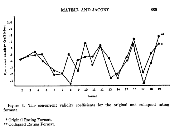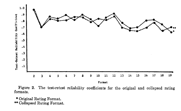 Two things changed my perspective.  The first was precipitated by being forced to teach psychometrics, which is minimally on the 5th level of Dante’s Hell teaching-wise.  For some odd reason at some point I did a deep dive into the psychometrics of scale response formats and found, much to my surprise, a long and robust history going all they way back to the 1920s.  I’ll give two examples.  Like the Preston & Colemen (2000) study that Michael cites, some old old literature had done the same thing (god forbid, replication!!!).  Here’s a figure showing the test-retest reliability from Matell & Jacoby (1971), where they varied the response options from 2 to 19 on measures of values:
