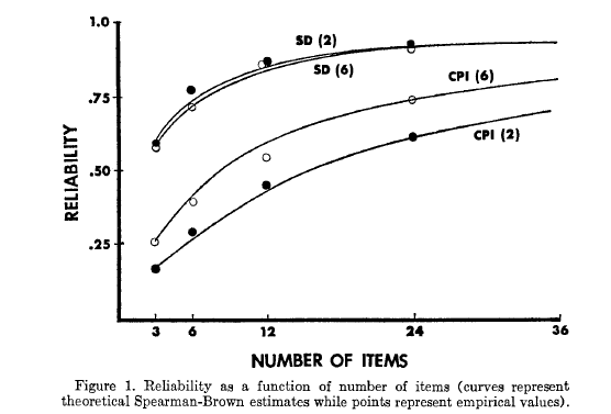 This set of findings is much more interesting.  When the measure is homogeneous, the rating format does not matter.  When it is heterogeneous, having 6 options leads to better internal consistency.  The authors’ discussion is insightful and worth reading, but I’ll just quote them for brevity: “A more plausible explanation, therefore, is that some type of response set such as an “extreme response set” (Cronbach, 1946; 1950) may be operating to increase the reliability of heterogeneous scales. If the reliability of the response set component is greater than the reliability of the content component of the scale, the reliability of the scale will be increased by increasing the number of scale points.”