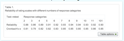 In a nutshell, the reliability is pretty good for two categories, but it gets somewhat better up to about 7-9 options, then goes down somewhat. In addition, scales with more than 7 options are rated as slower and harder to use. Now this doesn’t mean that all psychological constructs have enough resolution to support 7 or 9 different gradations, but at least simple ratings or preference judgements seem like they might.