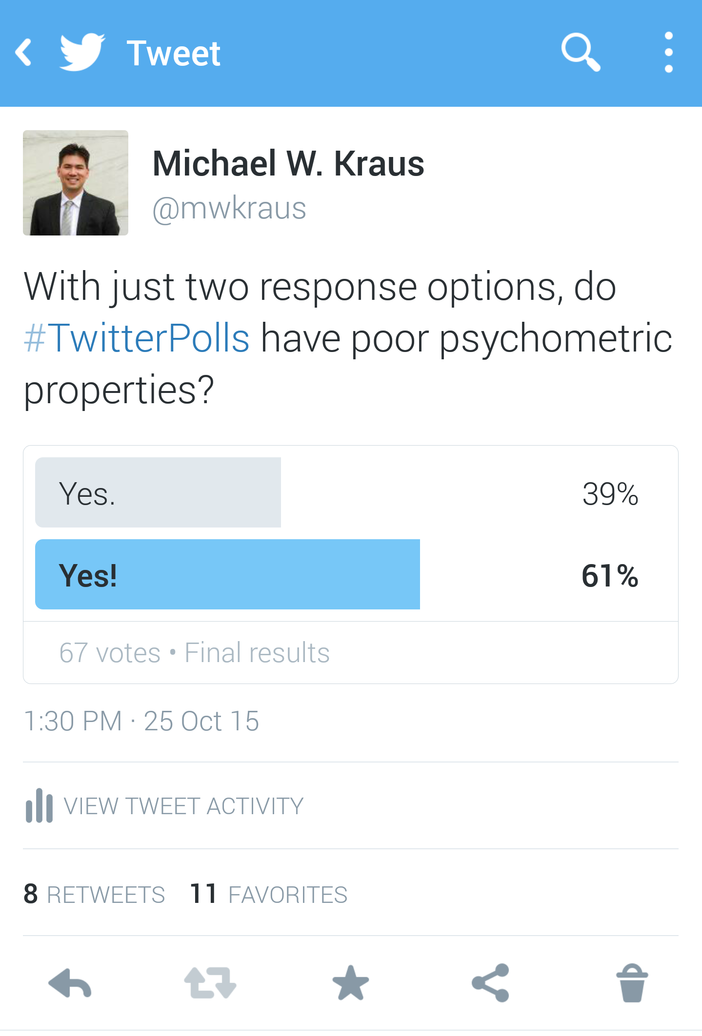 MK: Twitter recently rolled out a polling feature that allows its users to ask and answer questions of each other. The poll feature allows polling with two possible response options (e.g., Is it Fall? Yes/No). Armed with snark and some basic training in psychometrics and scale construction, I thought it would be fun to pose the following as my first poll: