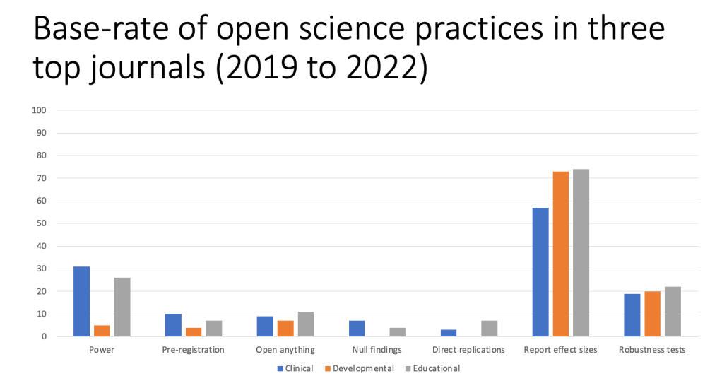 I mean, when one contemplates the number of reported power analyses in any published paper just a decade ago, this would clearly constitute an increase–there’s your glass half full. This rosy picture is backed up by the fact that the median number of participants in many journals has actually risen in the last decade (Fraley et al., 2022).